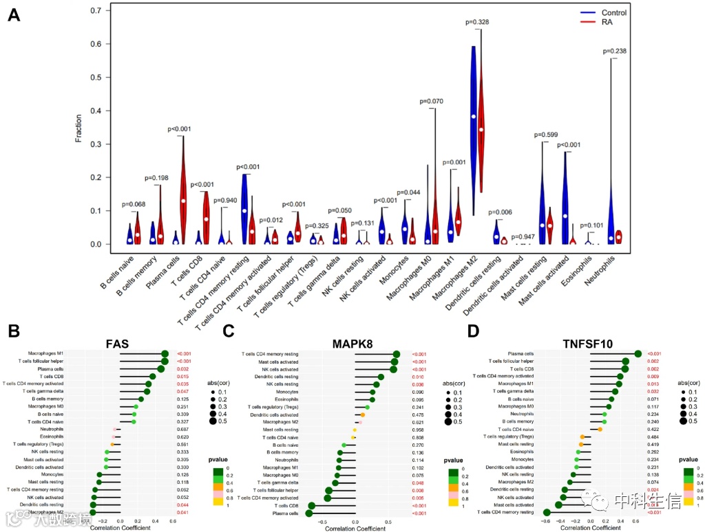 除了发病机制复杂外,RA还受免疫系统的影响很大。为了研究RA患者和健康对照之间免疫微环境的差异,采用了CIBERSORT算法。如图5A所示RA样本中浆细胞、T细胞CD8、T细胞滤泡辅助细胞和巨噬细胞M1的比例高于健康对照样本,而T细胞CD4记忆静息、NK细胞活化、单核细胞和肥大细胞活化在健康对照样本中表达更多。此外,还分析了特征基因高低表达与免疫微环境的关系。FAS和MAPK8与它们呈显著正相关,而TNFSF10在免疫细胞T细胞滤泡辅助细胞、浆细胞、CD8T细胞、CD4记忆激活T细胞和γδ细胞中与它们呈负相关。FAS和MAPK8之间存在显着的负相关,并且在TNFSF10和树突状细胞休息时发现了显着的正相关(图5B-D)。基于这些证据,FAS,MAPK8和TNFSF10可能强烈影响RA患者的免疫微环境。