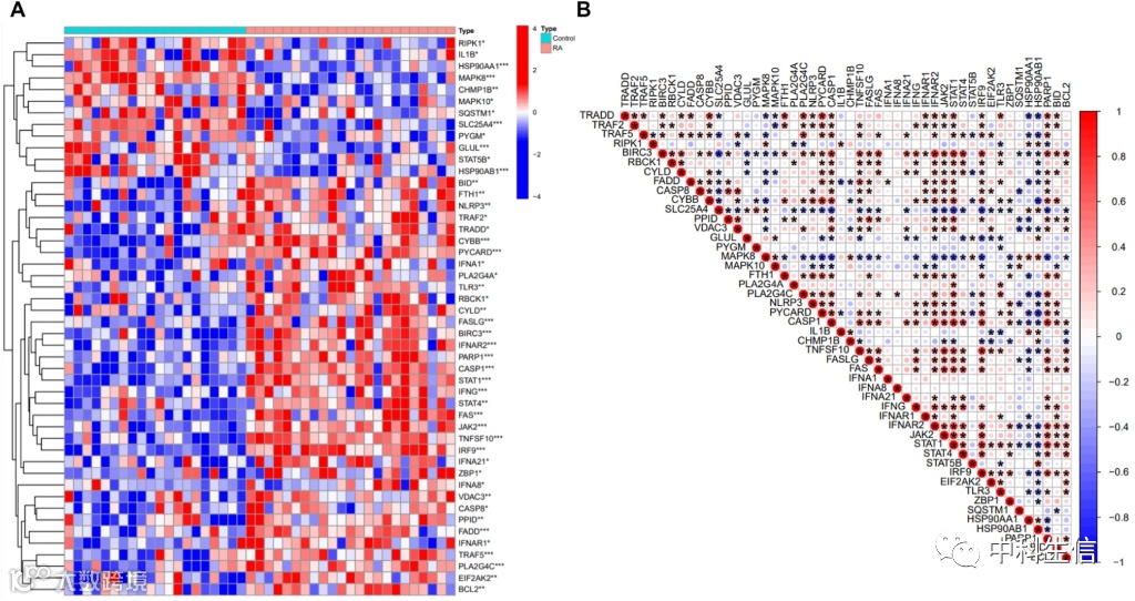 在实验数据集(GSE55235和GSE55457)中,包括23例RA患者滑膜组织和20例健康对照滑膜组织。差异分析结果显示,113个坏死性凋亡相关基因中,共有48个发现RA滑膜组织样本与健康对照样本之间存在差异,其中36个基因上调,12个基因下调。聚类热图显示了坏死性凋亡差异基因(NRDEGs)在RA样本和健康对照样本中的表达模式(图1A),NRDEG之间的相关性如图所示(图1B)。FAS与MAPK8、BIRC、JAK2和STAT1呈正相关,MAPK8与PYCARD、CASP1和TNFSF10呈负相关。IFNA1和IFNA8仅与FAD和PLA2G4C呈正相关。