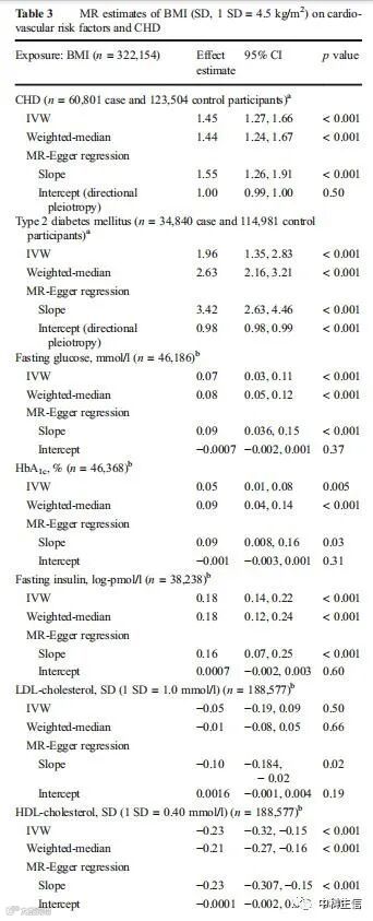 所有三种Mr方法都一致支持较高的BMI对较高的冠心病和2型糖尿病风险、空腹血糖、糖化血红蛋白、空腹胰岛素和三酰基甘油以及较低的高密度脂蛋白胆固醇的因果效应(表3)。没有一种方法支持BMI对ldl-胆固醇的因果效应(表3)。
