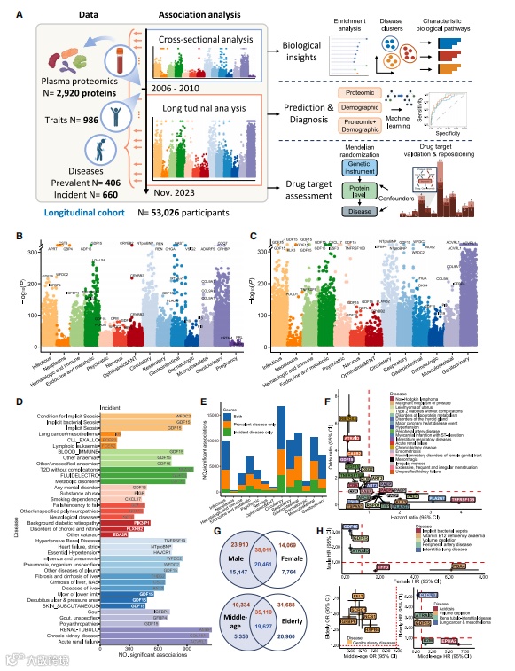尽管高通量蛋白质组学技术已取得进展,但以往研究多局限于单一疾病或小样本队列,缺乏覆盖多疾病、大样本的系统性图谱。因此,构建全面的血浆蛋白- 疾病 / 特征关联图谱,成为推动精准医疗从 “基因层面” 落地到 “临床实践” 的迫切需求。