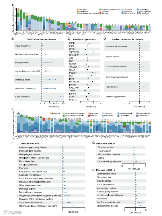 因果靶点聚焦:52.7% 的因果蛋白关联循环系统和代谢疾病,高血压关联的因果蛋白最多(20 种),FURIN 是其最强致病因子(OR=1.438,p=1.57×10⁻²⁷)。