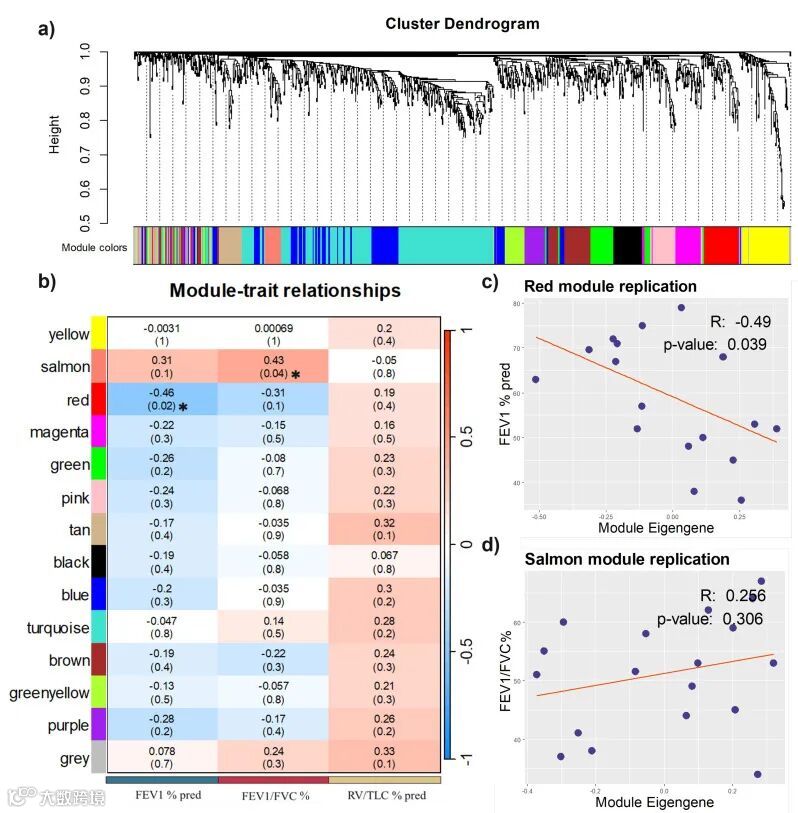 使用WGCNA构建蛋白质相关网络,以在COPD受试者开始ICS治疗之前识别与肺功能相关的生物学相关蛋白质模块。该分析揭示了13个不同的模块,每个模块在水平条中由独特的颜色表示(图 2a),我们进一步研究了这些模块与气流阻塞和过度充气严重程度之间的相关性,反映为:FEV1% pred、FEV1/FVC% 和 RV/TLC% pred。两个模块与不同肺功能参数的测量显着相关。红色模块特征值与通过 FEV1% pred 评估的严重气流阻塞相关(r = − 0.46, p = 0.02),salmon模块特征值与FEV1/FVC%相关(r = 0.43, p = 0.04)(图.2b)。