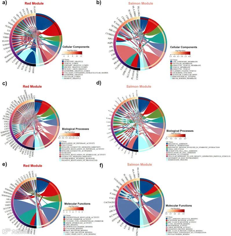 为了进一步深入了解已鉴定的蛋白质模块所反映的潜在生物学,我们使用基因本体(GO)分析检查了它们的功能作用。分析揭示了红鱼和鲑鱼模块在慢性阻塞性肺病病理学中不同但互补的作用。这两个模块都显示出与细胞成分类别中囊泡膜和分泌颗粒相关的蛋白质的显着富集,强调了它们与EV的结构相关性(图。3a-b)。红色模块蛋白主要富集免疫相关蛋白和抗微生物蛋白,包括含BPI折叠家族(BPIFB2/A1/A2)、乳转铁蛋白(LTF)和乳过氧化物酶(LPO)以及中性粒细胞弹性蛋白酶(ELANE)等中性粒细胞衍生蛋白。它还包括钙卫蛋白 (S100A8/A9) 等蛋白质,它们是已知的炎症调节剂(图 100A8/A9)(图3c)。此外,红色模块富含参与蛋白酶-抗蛋白酶平衡的蛋白质,包括胱抑素(2型,包括CST1/2/3/4/5)、SERPIN家族和基质金属蛋白酶9(MMP-9)(图3e)。相比之下,salmon模块富含神经三肽(NTM)、细胞间粘附分子1(ICAM1)和HLA II类组织相容性抗原(HLA-DRA/HLA-DRB1)等蛋白质,表明其在细胞粘附和稳态中起关键作用(图3d)。主要组织相容性复合物(MHC)成分和T细胞受体结合蛋白的存在突出了该模块参与T细胞介导的免疫和抗原呈递(图3f)。