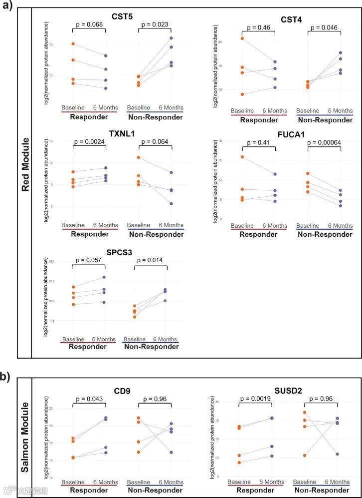 此外,我们比较了ICS反应者和无反应者之间的蛋白质丰度,以确定与治疗结果相关的基线差异。来自红色模块的几种蛋白质,包括 CST1、CST2、LPO、KLK13、钙连接蛋白(CANX)和羧肽酶 E(CPE),在反应者中显着升高,而与鲑鱼模块相关的带电多囊泡体蛋白1(CHMP1)和IST1在反应者中显着减少,如图4c-d所示。