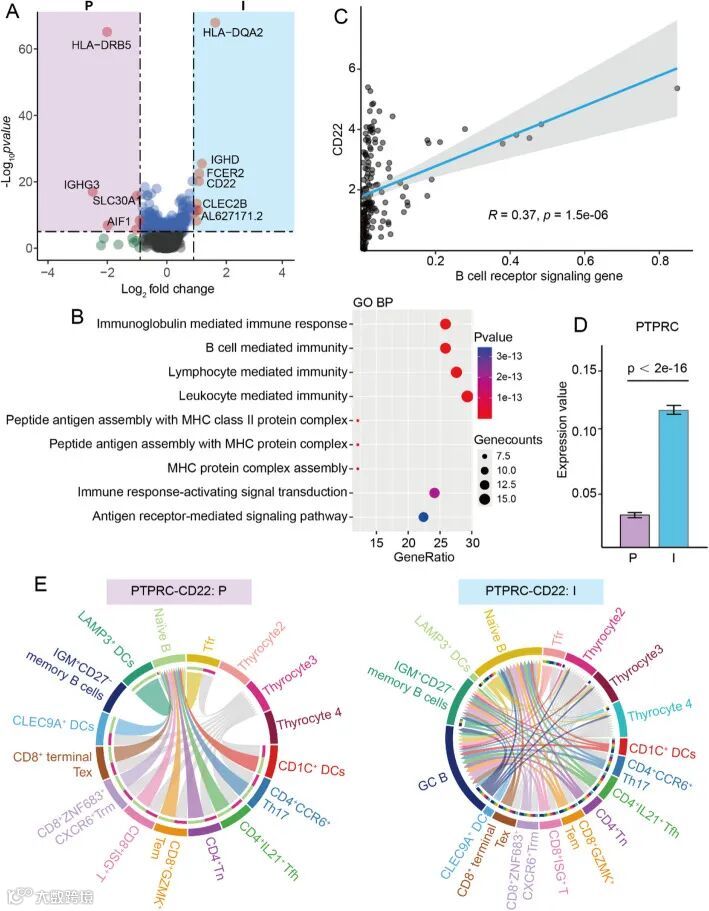 为了研究惰性和进展性PTC中TIL-B细胞的转录差异,研究团队比较了两组样本中差异表达的基因。重点分析了HLA-DQA2、IGHD、CD22等基因在惰性组和进展组中的表达情况,并进行了基因本体论(GO)分析。同时,通过TCGA数据库的Pearson相关性分析,评估了CD22与B细胞受体信号转导基因的相关性。