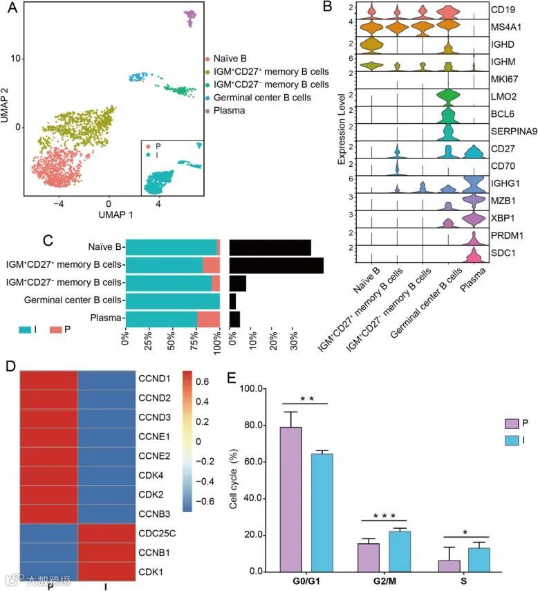 为了进一步研究惰性和进展性PTC中TIL-B细胞的增殖差异,研究者进行了无监督聚类分析,并根据差异表达基因(DEGs)的模式将B细胞分为5个亚群。使用基因集富集分析(GSEA),研究者评估了GC-B细胞与细胞周期和有丝分裂相关的通路上调情况。此外,研究团队还分析了所有TIL-B细胞中与细胞周期相关基因的表达,以比较两组之间的增殖能力差异。
