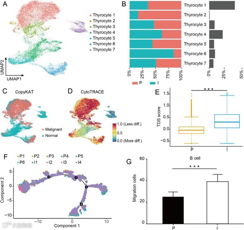 为研究惰性与进行性PTC中的甲状腺细胞异质性,研究团队基于差异表达基因(DEG)的模式,将甲状腺细胞划分为7个簇,并通过GSVA Hallmark分析揭示簇间的转录差异。进一步使用CopyKAT分析细胞的拷贝数变异(CNV),并采用CytoTRACE和甲状腺分化评分(TDS)预测细胞的分化状态。最后,结合Monocle算法分析了甲状腺细胞的分化轨迹。