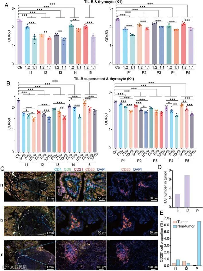 结果表明,来自惰性PTC的甲状腺细胞在招募外周B细胞方面的能力显著强于进展性PTC的甲状腺细胞。尽管对B细胞募集相关受体的分析(如CXCR4、CXCR5等)未显示两组之间的显著差异,但这些结果表明,惰性肿瘤中B细胞募集的增加主要归因于甲状腺细胞的能力。进一步的实验发现,来自惰性和进展性PTC的TIL-B细胞都能浓度依赖性地抑制PTC细胞的增殖,表明TIL-B细胞通过直接的细胞间相互作用和抑制蛋白分泌抑制肿瘤细胞增殖。总体而言,这些发现表明,TIL-B细胞可能在PTC的免疫微环境中扮演着重要的抗肿瘤角色。