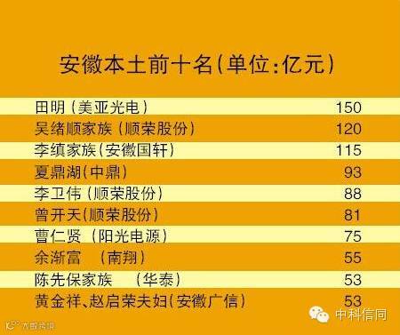 苏宁云商的张近东以810亿元的身家排名第9,成为皖籍富豪中的领头羊。正威国际的王文银是安徽潜山人,此次榜单中,他和妻子刘结红的身家达到550亿元,排在榜单第15位,史玉柱家族财富380亿元,排在皖人富豪第三,总榜单排名33位。