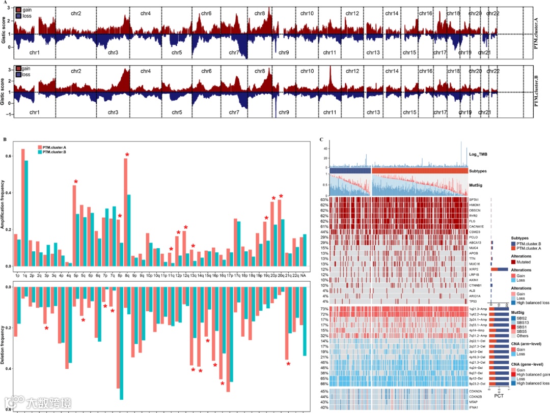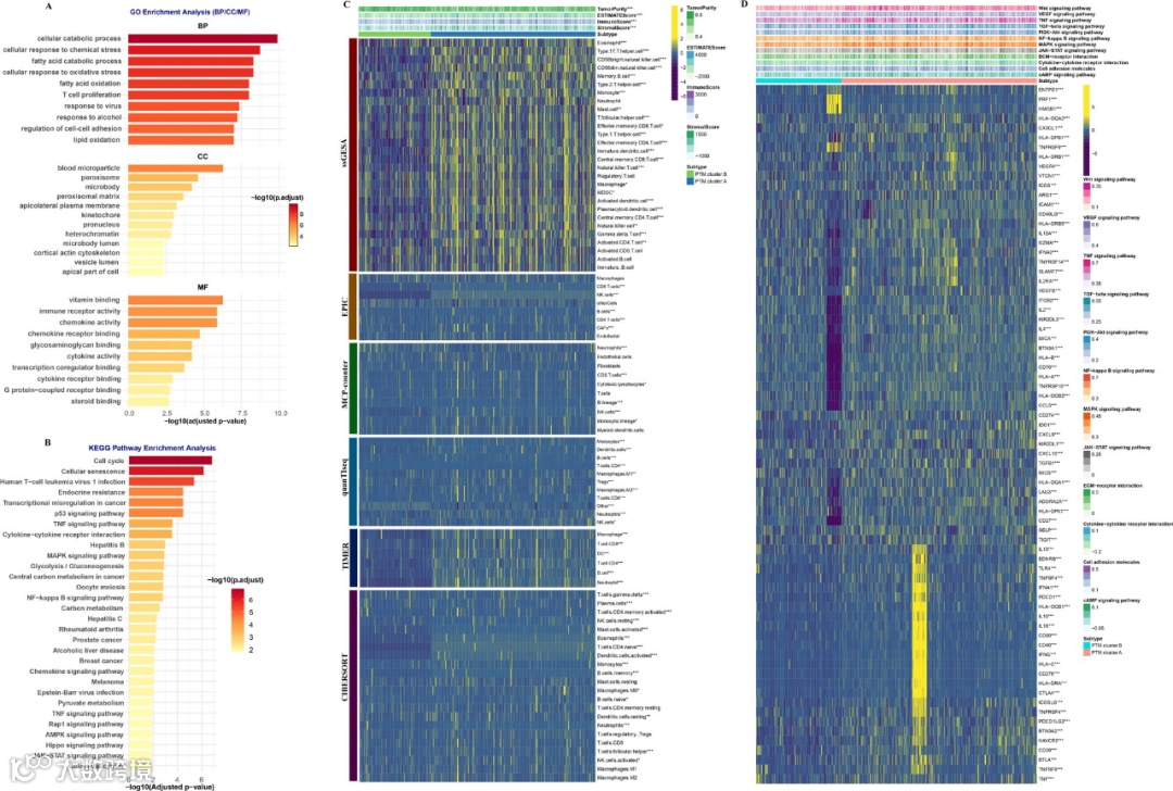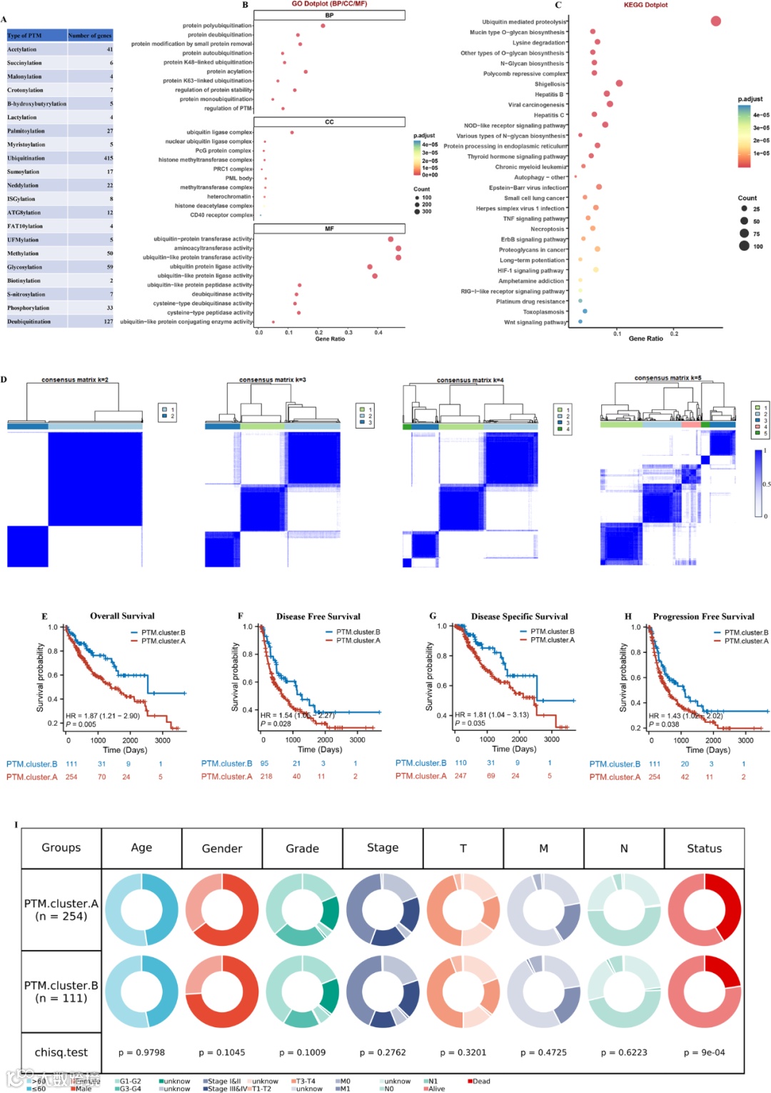 研究覆盖21种PTM相关基因(数量2-415个),经共识聚类确定k=2为最优分型(PTM.cluster.A/B)。A亚型患者OS、DFS等生存指标均显著差于B亚型,临床恶性程度更高,且相关基因富集于PTM及免疫通路。