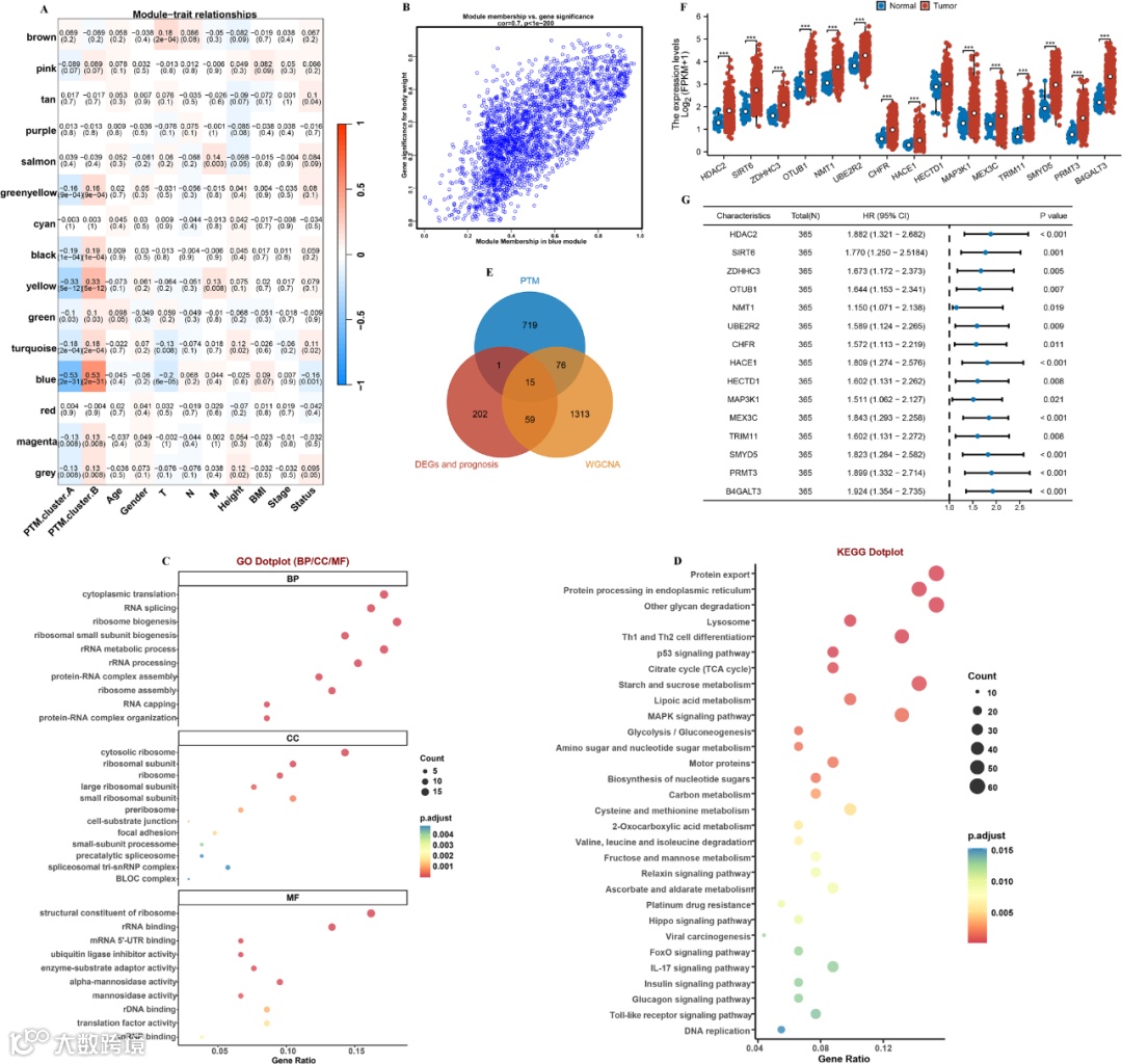 核心分析:先通过共识聚类将肝癌划分为2种PTM分子亚型,再用WGCNA筛选模块基因,结合差异表达基因(DEGs)和预后相关基因,最终锁15个hub基因;