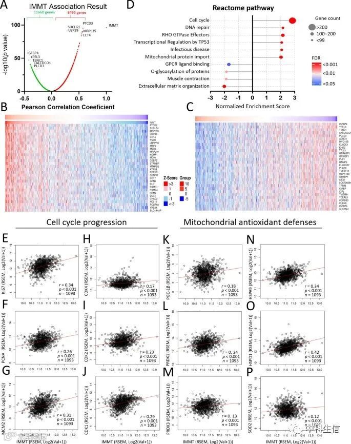 通过Linkedomics分析IMMT的功能富集情况,共有8495个基因与IMMT有明显的正相关,而11660个基因有明显的负相关(图7A),热图直观地显示了前30个单个基因(图7B,C)。基因集富集分析(GSEA)显示,与IMMT共同表达的基因参与了以下Reactome途径的激活:细胞周期、DNA修复、RHO GTP酶效应物、TP53感染性疾病的转录调控和线粒体蛋白导入(图7D)。同时,被抑制的途径包括:GPCR配体结合,蛋白质的O-糖基化,肌肉收缩,和细胞外基质组织(图7D)。同时富集的Reactome途径显示,细胞周期具有最高的归一化富集分数(NES),最多的基因数和最低的错误发现率(FDR)(图7D)。考虑到IMMT对细胞周期活动的主要影响,我们研究了它与癌症进展的关键生物标志物的关系。如图7E-J所示,IMMT水平与癌症增殖相关的生物标志物(KI67、PCNA和MCM2)以及细胞周期的关键调节器(CDK4、CDK2和CDK1)呈正相关。由于IMMT在调节氧化还原状态方面的关键作用,我们调查了它与BC肿瘤样本中线粒体抗氧化功能的关系。IMMT与PGC-1β(图7K)、PRDX1(图7L)、PRDX3(图7M)、HSPA9(图7N)、HSPD1(图7O)和SOD2(图7P)有正相关。这些结果表明,IMMT可能通过调节线粒体的氧化还原状态在BC细胞周期的进展中起作用。