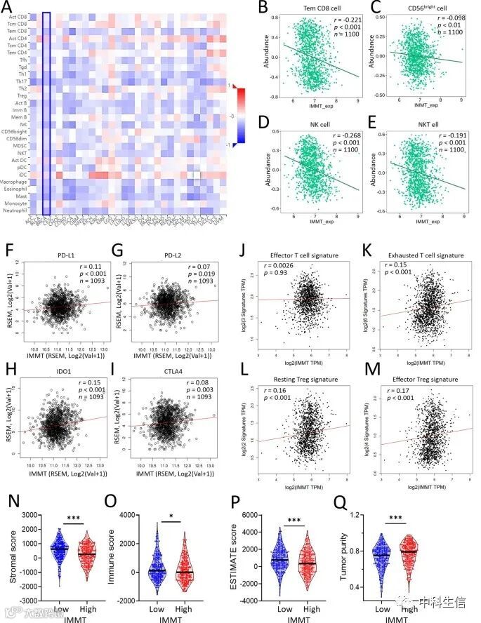 考虑到TIME在肿瘤生长、扩散和逃避免疫介导的破坏中的重要作用,分析了IMMT与肿瘤-免疫相互作用之间的关联。TISIDB的Spearman相关分析显示,IMMT的表达与BC中大多数肿瘤浸润淋巴细胞呈负相关(图6A),如效应记忆CD8 T细胞(图6B)、CD56bright杀伤细胞(图6C)、自然杀伤细胞(图6D)和自然杀伤T细胞(图6E)。此外,我们观察到IMMT与T细胞抑制因子有正相关,如PD-L1(图6F)、PD-L2(图6G)、IDO1(图6H)和CTLA4(图6I)。使用GEPIA2进行的Pearson相关分析表明,IMMT与效应T细胞特征没有明显的相关性(图6J),而与衰竭T细胞特征(图6K)、静止Treg细胞特征(图6L)和效应Treg细胞特征(图6M)显示出明显的正相关关系。此外,ESTIMATE分析表明,高IMMT的队列表现出基质评分(图6N)、免疫评分(图6O)和ESTIMATE评分(图6P)的降低,同时显示出肿瘤纯度的提高(图6Q)。总之,这些结果表明,IMMT的过度表达与免疫抑制性TIME有关。