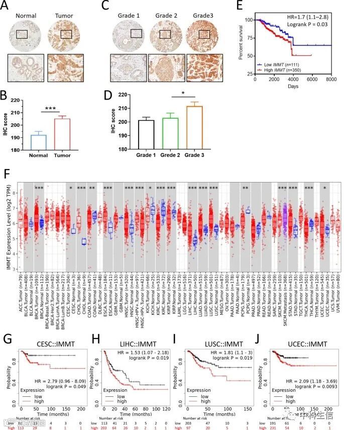 为了验证IMMT的临床价值,收集了BC患者(n = 461)的肿瘤组织和临床文件。IHC染色显示,肿瘤组织表达的IMMT水平高于肿瘤毗邻的正常组织(图9A,B),3级肿瘤组织表达的IMMT水平高于2级(图9C,D)。Kaplan-Meier分析显示,IMMT IHC评分高的患者的OS时间减少(图9E)。与观察到的生物信息学结果类似,与低IMMT相比,高IMMT的3级患者的总生存时间更短,即使没有统计学意义。在这方面,我们的临床发现与多组学数据相符。