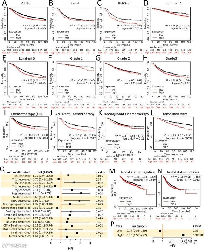 为了更深入地了解预后,我们研究了IMMT表达与生存率之间的相关性。无复发生存期(RFS)被认为是发生转移的一个适当指标。我们发现BC患者的IMMT高表达与RFS时间减少有关(图4A),IMMT在HER2-E型、管状A型和管状B型中起到了预后指标的作用,但在基底型中没有(图4B-E)。IMMT的高表达表明3级BC患者的RFS时间减少,而在1级和2级中没有发现差异(图4F-H)。在治疗方案方面,IMMT高表达表明接受所有类型的化疗、辅助化疗或他莫西芬的BC患者的RFS时间减少,但新辅助化疗则不然(图4I-L)。此外,IMMT可以作为阴性结节患者预后的独立因素,而不是阳性结节患者预后的独立因素(图4M,N)。由于肿瘤浸润性免疫细胞(TIICs)是TIME不可缺少的部分,并与临床结果有牵连,因此在免疫方面研究了IMMT对BC的预后价值。高IMMT并不表明RFS时间的减少,BC肿瘤中的辅助T细胞1型(Th1)减少,Th2减少,间质干细胞(MSC)富集,巨噬细胞减少,嗜碱性细胞减少,CD4 + T细胞减少和B细胞减少(图4O)。高IMMT表明高肿瘤突变负担(TMB)的BC肿瘤的RFS时间减少,但低TMB的肿瘤则没有(图4P)。总的来说,高IMMT对BC患者的预后是不利的,特别是在HER-2E亚型、管腔A和管腔B、肿瘤3级、接受辅助化疗和他莫昔芬治疗以及阴性结节患者。