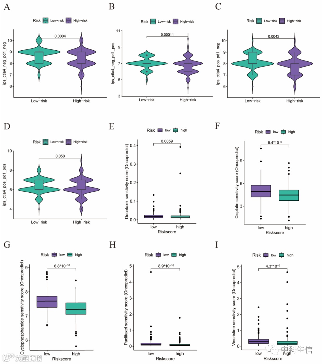 包预测一些常用化疗药物的疗效,发现高危组的敏感性评分明显较低,表明化疗反应较好