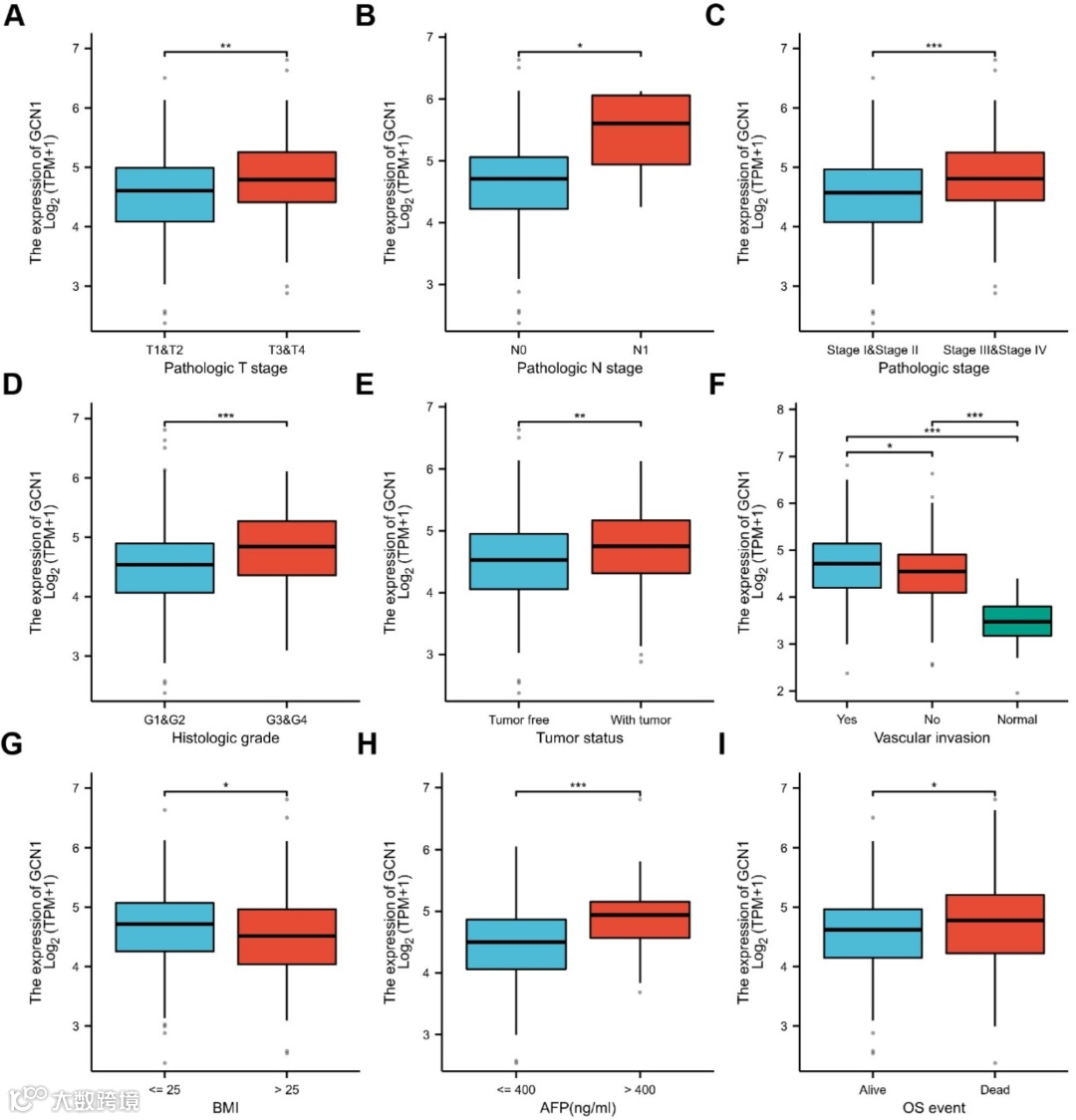 图2. GCN1表达水平与HCC患者临床特征的相关性