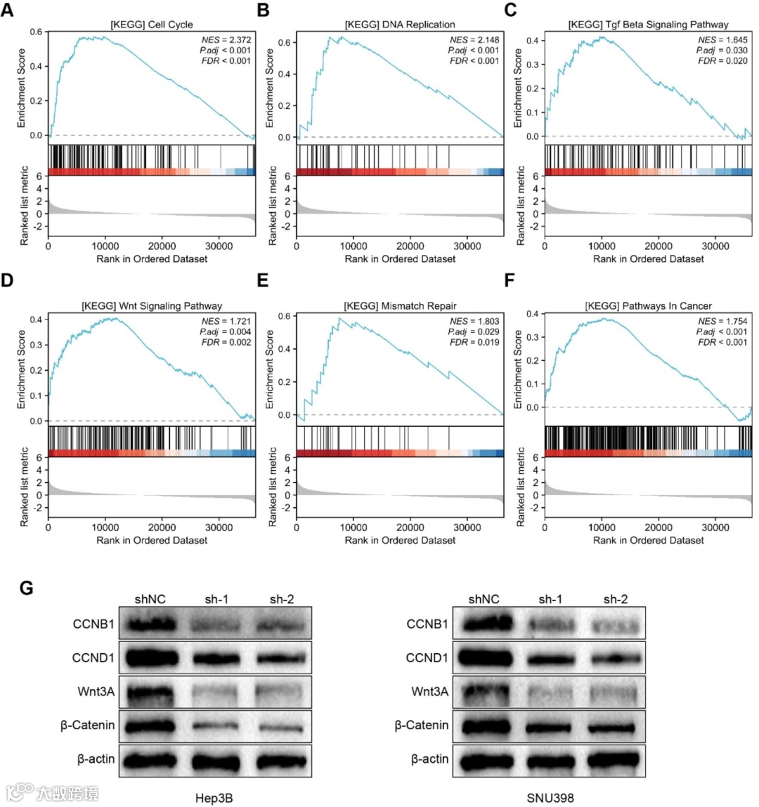 GSEA分析发现GCN1高表达与细胞周期、DNA复制、Wnt信号通路等肿瘤相关通路显著相关,Western blot实验证实,敲低GCN1可下调细胞周期蛋白CCNB1、CCND1及Wnt信号通路关键蛋白Wnt3A、β-连环蛋白的表达,明确了其调控HCC细胞恶性表型的分子机制。