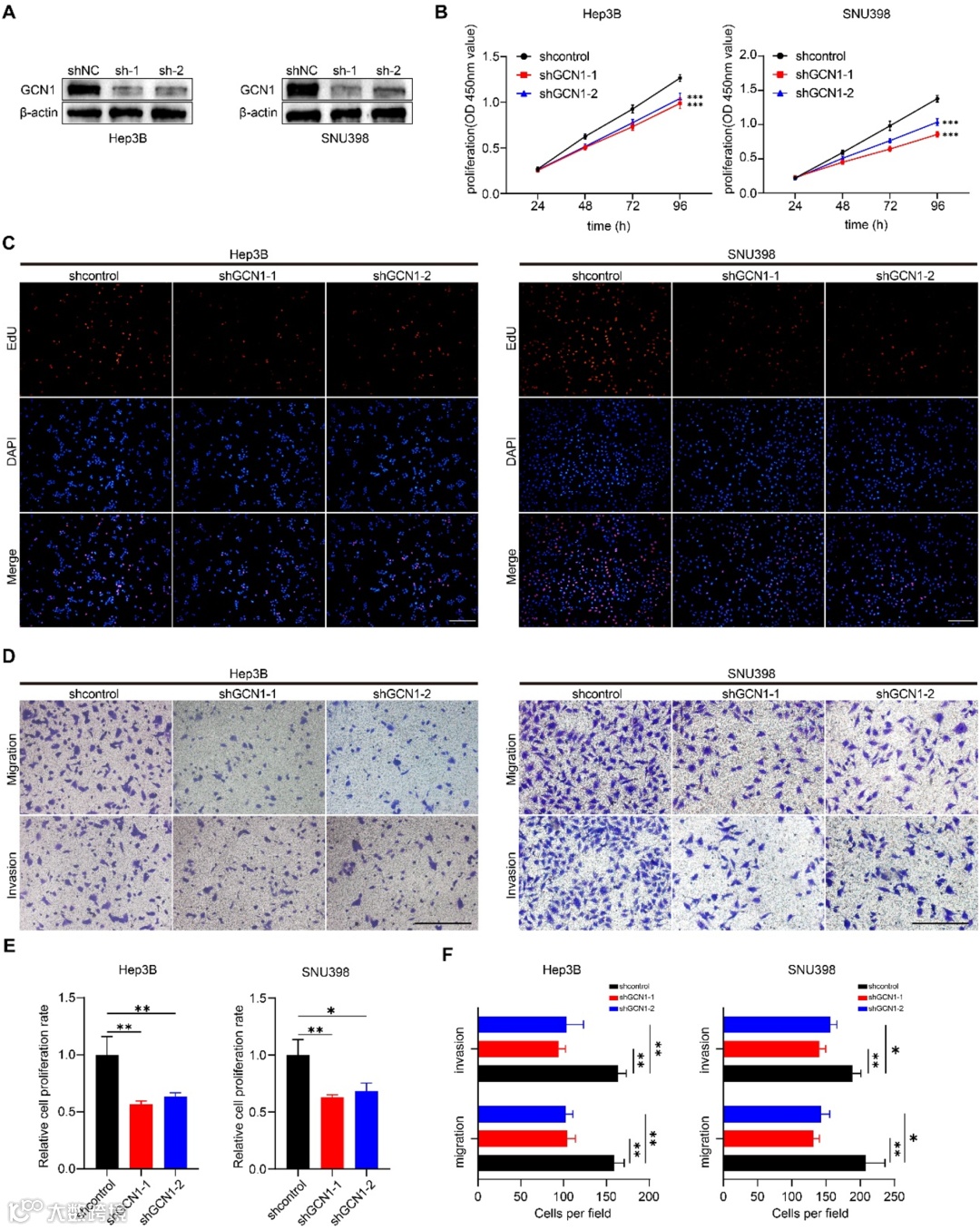图7. 敲低GCN1抑制肝细胞癌的增殖与转移