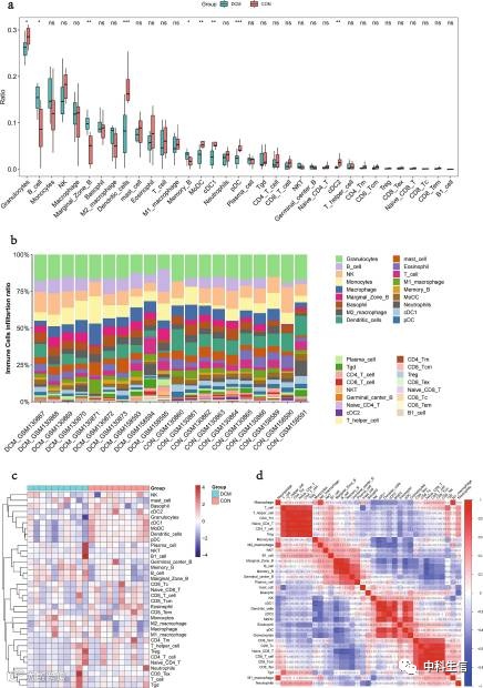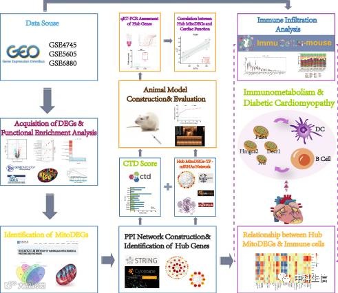 大家好!今天小编和大家分析一篇23年1月发表在J Transl Med.(IF:5.531)杂志的文章《Role of mitochondrial metabolic disorder and immune infiltration in diabetic cardiomyopathy: new insights from bioinformatics analysis 》。作者通过GEO2R筛选差异表达基因(DEG),并进行了GSEA,GO和KEGG通路分析,获得了线粒体相关DEGs(MitoDEGs)。随后,构建了PPI网络,通过CytoHubba、MCODE和CTD评分鉴定到了与糖尿病心肌病(Diabetic cardiomyopathy,DCM)密切相关的4个关键MitoDEGs。并通过利用Cytoscape和miRWalk数据库预测到了关键MitoDEGs的转录因子和靶向miRNA,建立了调控网络。还利用ImmuCellAI分析了DCM中的免疫浸润模式。此外,通过建立大鼠模型,发现4个关键MitoDEGs(Pdk2,Hmgcs1,Decr4和Ivd)表现出与生物信息学分析结果一致的表达趋势。