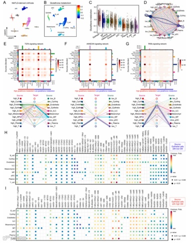 图4. 单细胞RNA测序分析揭示了非酒精性脂肪性肝病(NAFLD)衍生的肝硬化中不同细胞类型代谢活动的异质性。(A) 在UMAP图谱中鉴定并标注了NAFLD来源肝硬化样本中的10种细胞类型。(B) 采用单样本基因表达富集分析(ssGSEA)量化谷胱甘肽代谢水平,并通过颜色梯度映射至各细胞类型以显示代谢强度。(C) 上皮细胞谷胱甘肽代谢水平最高,免疫细胞最低。(D) 不同谷胱甘肽代谢水平的T细胞间呈现最强信号传递。(E-G) 不同谷胱甘肽代谢水平细胞群体的信号网络。(H & I) 上皮细胞与其他细胞类型的配体-受体相互作用。