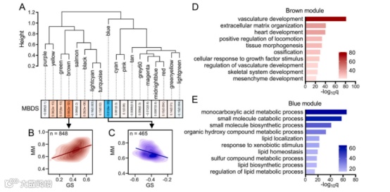 图6. 不同MBDS水平的HCC样本中观察到不同的生物学功能。(A) 基于359例TCGA HCC样本转录组数据及其对应MBDS值进行WGCNA分析。(B) 含848个基因的棕色模块与MBDS呈正相关,(C) 而含465个基因的蓝色模块则与MBDS呈负相关。(D-E) GO富集分析。