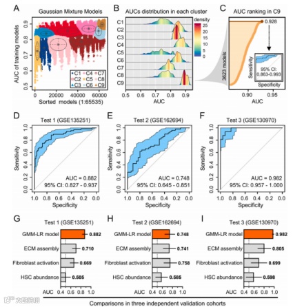 图3. 基于MBDS的机器学习模型用于区分非酒精性脂肪性肝病(NAFLD)的纤维化程度。(A) 采用高斯混合模型(GMM)算法,共生成65,535个逻辑回归(LR)模型并划分为9个簇。(B) 第9簇在所有簇中呈现最高曲线下面积(AUC)分布。(C) 从第9簇的3623个模型中筛选出最佳逻辑回归模型,其AUC值达0.928。(D-F) 该模型在三个独立NAFLD队列(标注为F0-1级与F3-4级)中进行预测性能验证。(G-I) 将GMM-LR模型的预测能力与三项生物学特征进行比较。