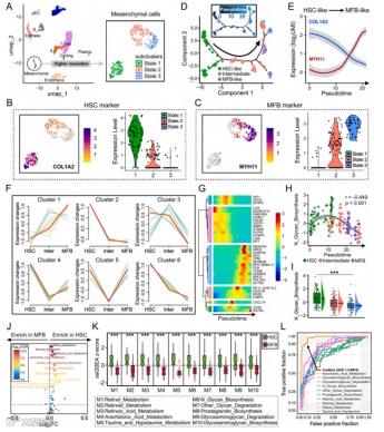 图5. 在肝星状细胞(HSC)向肌成纤维细胞(MFB)分化过程中观察到代谢特征的显著改变。(A)间充质细胞被划分为三个亚群。(B-C)间充质细胞三个亚群中COL1A2和MYH11的表达分布。(D) 状态1到状态2,最终到状态3的分化方向。(E) 间充质细胞中COL1A2和MYH11的表达逐渐变化。(F) 114条代谢通路聚类为6种独特模式。(G) 间充质分化过程中6种模式中特异性标记物的表达变化。(H) 间充质细胞三种状态关联性详情及(I)活性差异。(J) HSC与MFB细胞间显著改变的代谢通路。(K) HSC与MFB细胞间前10位显著改变的代谢通路。(L) 代谢特征组合能精确区分HSC与MFB。