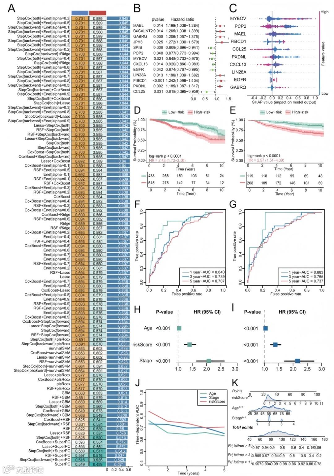 单变量Cox回归分析表明,RiskScore、年龄及肿瘤分期与总生存期显著相关(图2H);多变量Cox回归分析进一步证实,这三项指标均为预后的独立预测因子(P<0.001,图2I)。此外,时间依赖性ROC分析显示,RiskScore的预测效能优于传统临床指标(图2J)。研究还构建了整合RiskScore、年龄及肿瘤分期的列线图,用于总生存期的预测(图2K)。