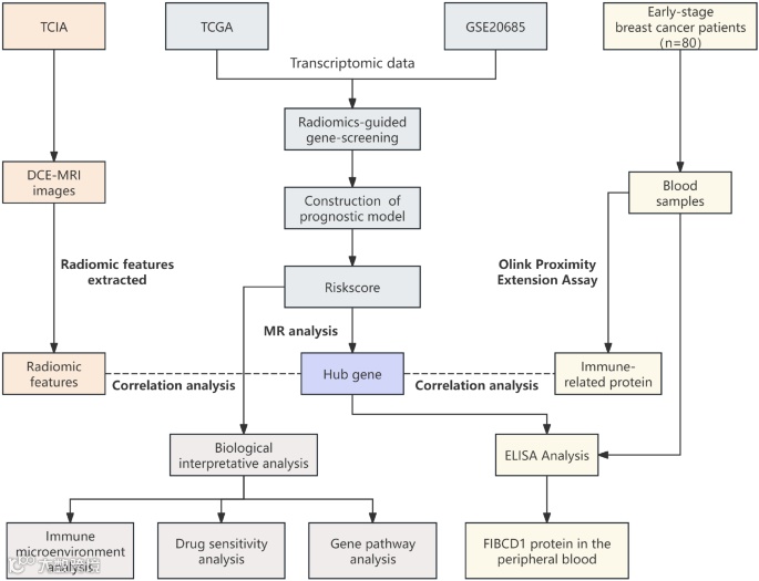 本研究通过创新的“宏观-微观-宏观”放射基因组闭环框架,成功搭建了MRI影像特征与分子机制之间的桥梁,构建出兼顾精准度与临床转化潜力的乳腺癌预后模型。该模型整合的10个共识基因中,FIBCD1被证实为核心枢纽基因——不仅与乳腺癌患者生存期存在明确因果关联,其血浆表达水平可作为腋窝淋巴结负荷的潜在风险指标,还能通过调控OSM、TNFSF14等炎症蛋白参与免疫调节,同时与肿瘤形态圆度、灰度均一性等关键放射组学特征直接联动。此外,研究明确了不同风险组的免疫微环境差异与药物敏感性特征,为临床个体化治疗方案选择提供了数据支撑。总体而言,FIBCD1作为兼具“影像关联特性、免疫调节功能、预后预测价值”的多维度生物标志物,为乳腺癌非侵入性风险分层、靶向治疗靶点开发提供了全新方向,也进一步验证了放射组学与多组学整合策略在肿瘤精准医学研究中的核心价值。