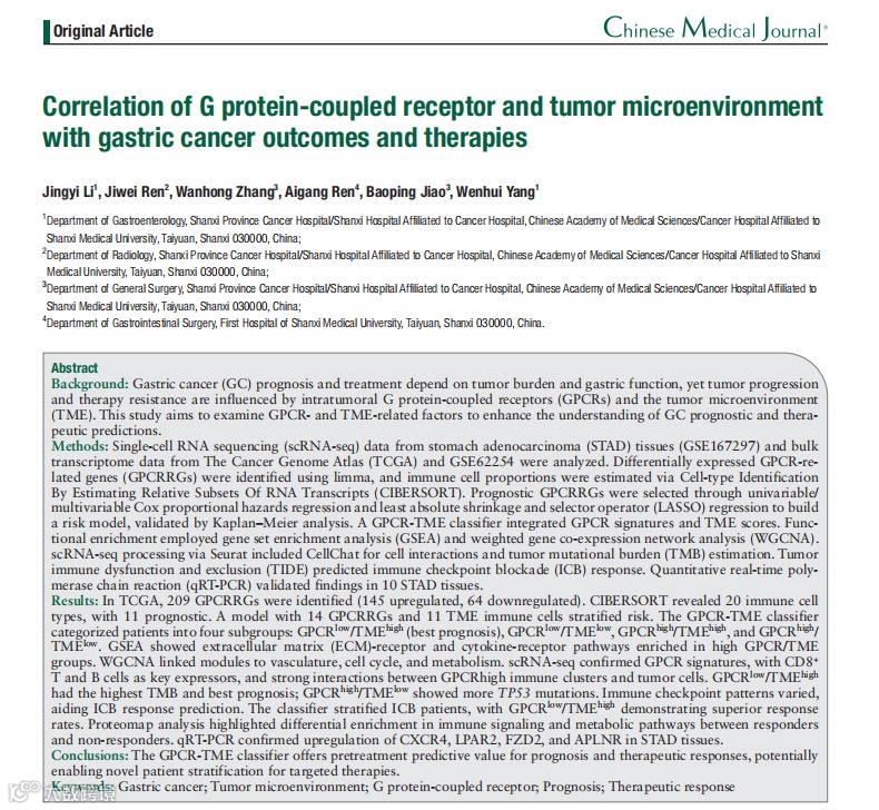 胃癌作为全球高发癌种,治疗后预后差异特别大,有的患者术后能长期生存,有的却很快复发。过去医生主要靠肿瘤大小、是否转移这些“表面特征”判断预后,但忽略了肿瘤内部的“隐形玩家”:比如G蛋白偶联受体(GPCR,细胞表面的“信号接收器”,能调控细胞生长、转移)和肿瘤微环境(TME,肿瘤周围的免疫细胞、基质细胞等“邻居”)。