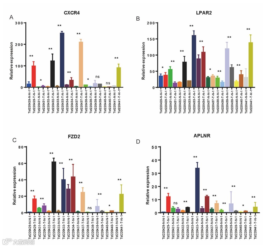 最后一步是“落地验证”:研究团队找了10例胃癌患者的肿瘤组织和正常组织,用qRT-PCR(一种实验室常用技术)检测之前发现的4个关键GPCR基因(CXCR4、LPAR2、FZD2、APLNR)——结果和数据库分析一样:这4个基因在胃癌组织里确实表达更高(图7)!