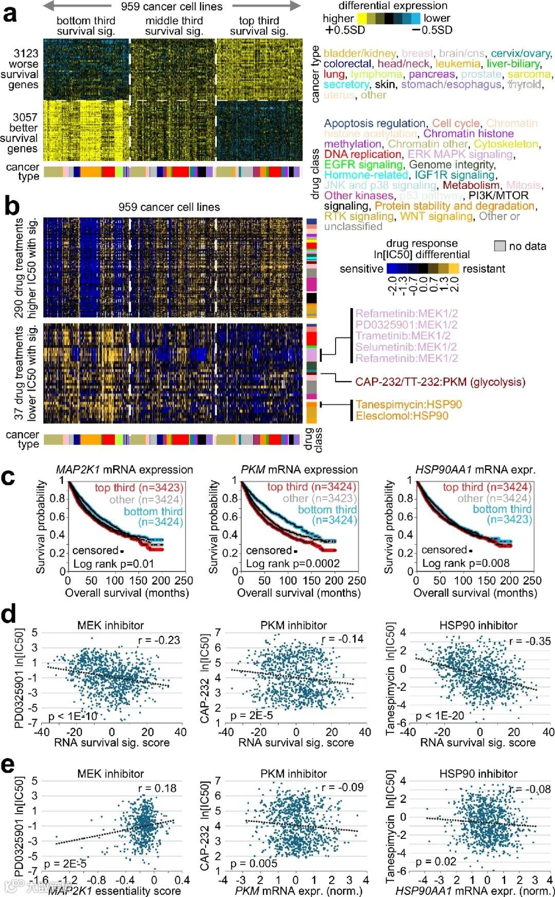 在RNA特征与IC50之间呈负相关的37种药物化合物中,包括MEK1/2、PKM(糖酵解途径的核心)和HSP90的抑制剂。这三种化合物的靶基因——特别是MAP2K1、PKM和HSP90AA1——在泛癌分析中均表现出较高的表达,并且与较差的患者生存相关(图7c)。关联结果表明,具有较高特征评分的细胞系通常对这三种药物更为敏感(图7d)。此外,敏感于MEK1/2抑制的细胞系通常将MAP2K1作为细胞生长的必需基因(图7e),而敏感于PKM或HSP90抑制的细胞系则分别表现出PKM或HSP90AA1的高表达(图7e)。