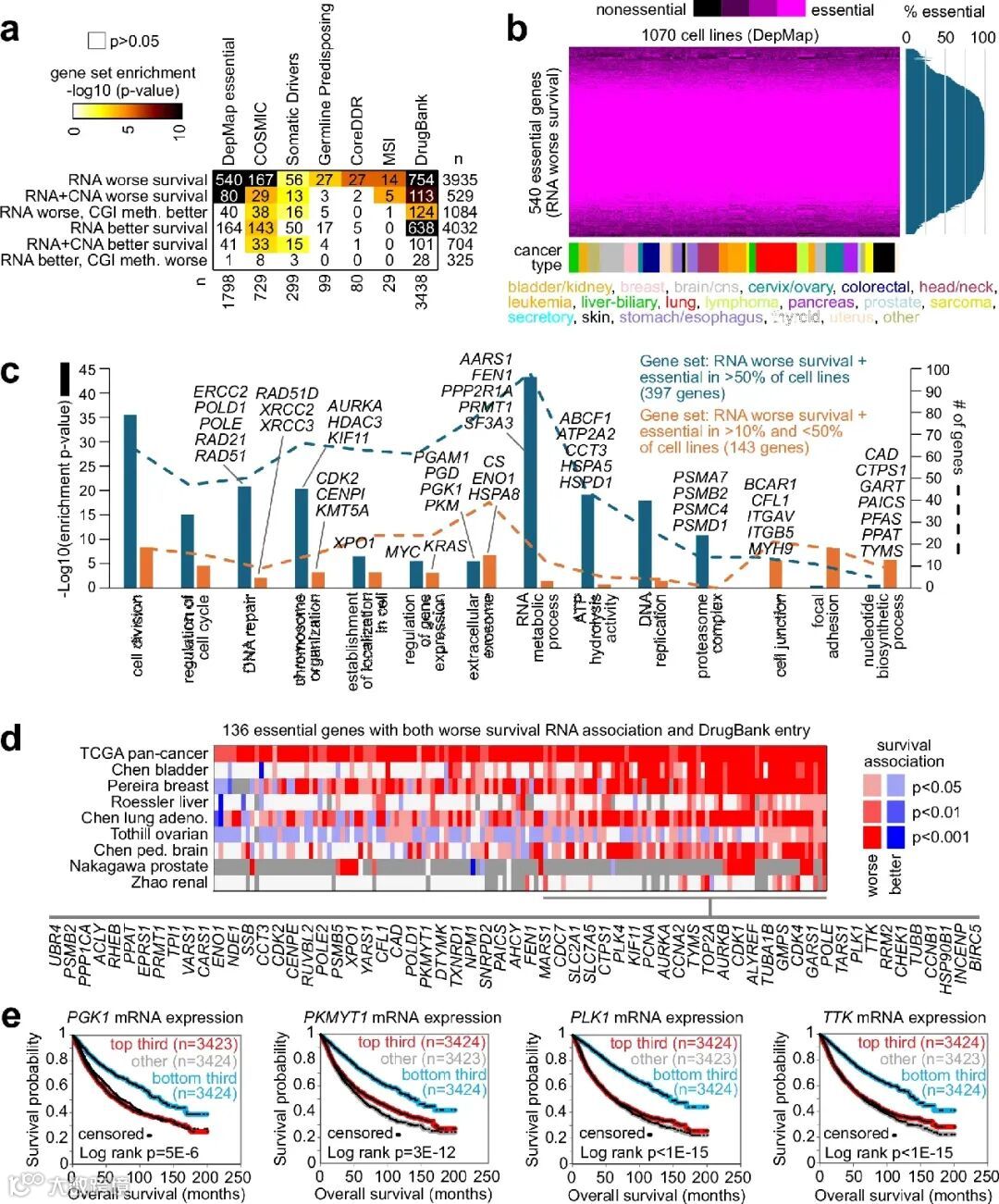 对540个必需基因进行了GO功能基因类别的分析。同时也对397个对大多数DepMap细胞系必需的基因和其他143个基因进行GO分析(图6c)。与较差生存相关且在超过一半细胞系中为必需的基因,在GO术语上高度富集于“细胞分裂”、“DNA修复”、“染色体组织”、“蛋白酶体复合物”和“RNA代谢过程”等类别。那些在不到一半但超过10%的细胞系中为必需的基因,则显著富集于“细胞连接”、“粘附点”和“核苷酸生物合成过程”等GO术语中(图6c)。总共136个基因在RNA生存关联中较差,且在DepMap中为必需,且在DrugBank中有条目,这些基因大多在多个独立的肿瘤基因表达数据集(TCGA之外)中表现为高表达与较差生存的关联(图6d)。136个基因中的激酶基因包括PGK1、PKMYT1、PLK1和TTK(图6e),其中PGK1涉及糖酵解途径(图5a)。