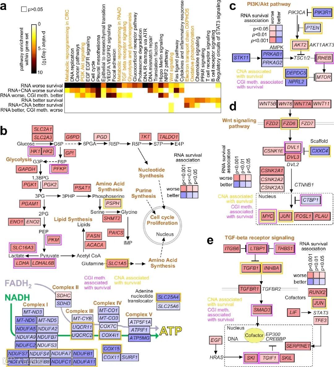 感兴趣的其他通路富集了与生存相关的基因,包括PI3K/Akt通路(图5c),其中通路促进基因——包括AKT2、RHEB和MTOR——其RNA表达与较差的生存相关,而通路抑制基因——包括PIK3R1、PTEN、STK11和DEPDC5——其RNA表达与较好的生存相关。PI3K/Akt通路基因的共识CNA生存关联涉及AKT2、PIK3R1、PTEN和DEPDC5。与较差生存相关的Wnt信号通路基因包括WNT5B、WNT6、WNT7A、WNT11、FZD2、FZD6、FZD7、DVL1和DVL3,其中DVL1还涉及较低的CGI甲基化与较差结果的关联(图5d)。与较差生存相关的TGF-beta受体信号通路基因包括TGFB1、INHBA、TGFBR1和SMAD3,其中TGFB1和INHBA涉及共识的CNA关联,而SMAD3涉及共识的CGI甲基化关联(图5e)。