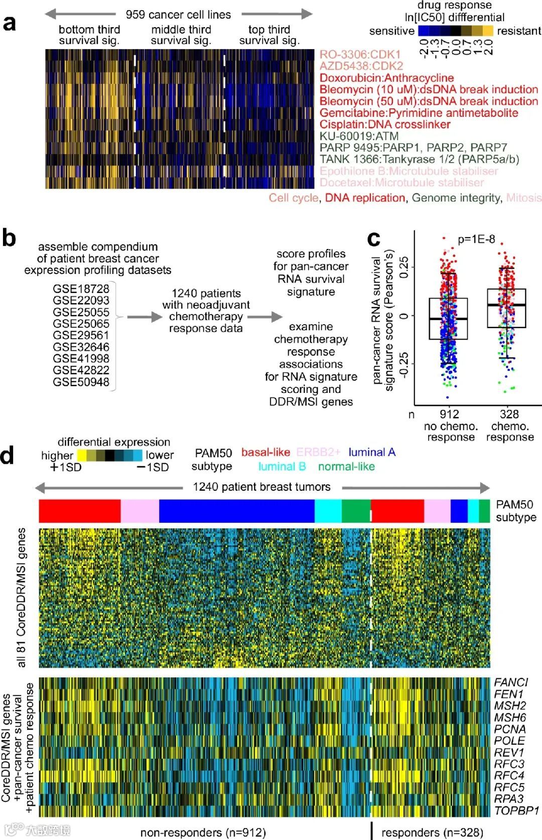 RNA特征与IC50之间呈负相关的37种药物化合物包括了化疗药物以及针对细胞周期、DNA复制、基因组完整性或有丝分裂的药物(图8a)。这些基于细胞系的发现可以扩展到接受新辅助化疗的乳腺肿瘤患者的基因表达谱,治疗结束时记录了患者的反应,涵盖了1240名患者,并涉及八个不同的基因表达数据集(图8b)。当对1240个乳腺肿瘤进行泛癌RNA生存特征评分时,病理学上有化疗反应的患者的特征评分高于无反应患者(图8c),这与生存特征能够预测细胞系对化疗药物的敏感性一致。基底样乳腺癌在生存特征上的得分平均较高,基底样亚型通常对化疗反应较好。如前所述,泛癌分析中与较差生存相关的基因高度富集于DNA损伤反应和微卫星不稳定性(MSI)基因(图6a),同时还富集于与细胞周期和DNA错配修复途径相关的基因(图5a)。在1240个乳腺肿瘤的基因表达谱中,DNA损伤反应和MSI基因在化疗反应者中明显高于非反应者(图8d),这与携带广泛DNA突变并伴随DNA损伤的癌症对化疗最为敏感,同时也代表了更具攻击性的癌症的情形一致。高表达的RNA泛癌生存特征较差基因在乳腺癌患者中与化疗反应强相关的基因包括DDR/MSI基因FANCI、FEN1、MSH2、MSH6、PCNA、POLE、REV1、RFC3、RFC4、RFC5、RPA3和TOPBP1(图8d)。