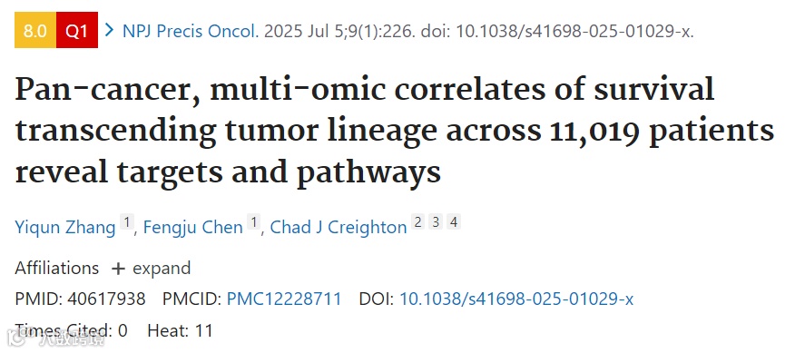 现在,单纯肿瘤的生信分析想发高分越来越难了,越来越多的期刊倾向于于泛癌或多组学的生信分析。今天小编要和大家分享的这篇文章就是关于泛癌的,这篇文章是2025年7月发表在《npj Precision Oncology 》(IF:8.0)期刊上的文章《Pan-cancer, multi-omic correlates of survival transcending tumor lineage across 11,019 patients reveal targets and pathways》。这篇文章有什么亮点呢,一起跟着小编来看一下叭~