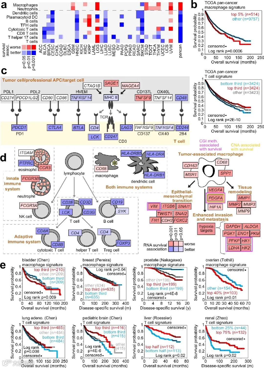 癌细胞的新兴标志物和使能特征包括逃避免疫细胞的攻击和消除以及肿瘤促进性炎症。我们对TCGA RNA谱进行了评分,使用一组代表免疫浸润的基因表达签名,并确定了每个签名评分与患者OS的关联。在评估的24种不同免疫签名中,有11种在泛癌分析中与患者生存相关(FDR<5%,名义p<0.01,Cox修正癌症类型),其中10种涉及与签名趋势一致的个别经典基因标记关联(图2a–d)。与所有癌症患者生存较差相关的免疫签名包括巨噬细胞和中性粒细胞,而与较好患者生存相关的签名包括T细胞、B细胞和树突状细胞。除了泛癌分析结果外,巨噬细胞和中性粒细胞分别与七种和八种单独的癌症类型的较差预后显著相关,而T细胞与10种单独癌症类型的较好预后显著相关(图2a)。特别是在检查巨噬细胞和T细胞签名时,尽管绝对风险差异较为细微,与其他基因或签名相比,仍然可以分别根据癌症类型显著地将患者分为较高风险和较低风险组(图2b)。