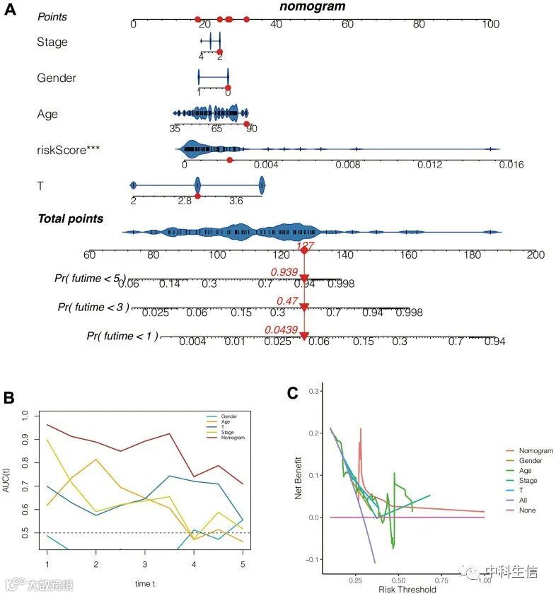 患者TCGA-VD-AA8N的1、3、5年病死率分别为0.0439、0.47、0.939。ROC的C指数为0.849 95%CI:(0.771, 0.928),表明此列线图在评估患者预后方面具有很高的准确性。连续预后ROC分析发现列线图评价患者预后的ROC曲线下面积均在0.8以上,高于其他临床特征。此外,患者根据列线图进行的临床干预比性别、年龄、肿瘤大小、分期等其他临床特征更有利于患者。