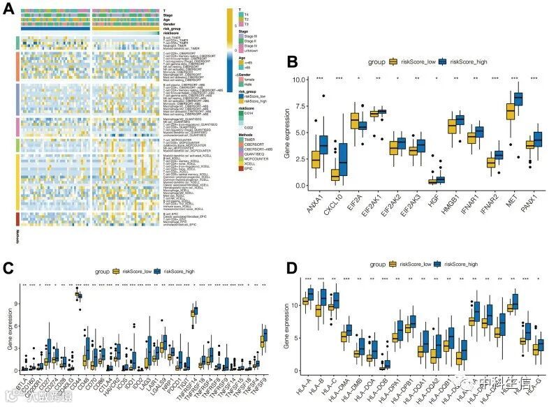 进一步分析了高风险组和低风险组之间的肿瘤免疫微环境。使用多种方法进行肿瘤免疫浸润分析,绘制热会展示,表明两组之间免疫细胞分布显著不同。此外,使用Wilcoxon 检验比较了之前研究人员认可的79个免疫检查点基因的表达,与低风险组相比,高风险组肿瘤坏死因子和白细胞抗原基因的表达水平均增加。