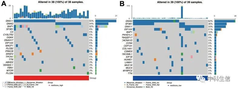 在高风险组中,突变前5位的基因分别为GNA11、GNAQ、BAP1、SF3B1、C3。然而,在低风险组中,前五个基因是GNA1、SF3B1、GNA11、EIF1AX和BAP1。常见的突变基因是GNA11和BAP1。有研究表明基因GNAQ突变是Gq通路的经典改变,在高风险人群中更常见,这意味着预后特征与Gq通路存在潜在相关性。
