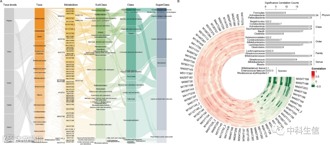 为了获得 CPP 组肠道菌群的代谢潜力,我们分别计算了 6 个分类水平(包括门、纲、目、科、属和种)中 CPP 组差异表达微生物和粪便代谢物的 Spearman 相关系数。该程序在合并正离子和负离子模式后使用具有注释名称的代谢物。在 262 种差异代谢物中,我们观察到 64 种代谢物与 23 种肠道微生物具有强相关性(Spearman 相关系数 > = 0.3 或 < = - 0.3,BH 校正p-值 < 0.05)。这些代谢物涉及脂质和类脂质分子、有机杂环化合物、苯环化合物、有机酸和衍生物、有机氮化合物、有机氧化合物、核苷、核苷酸和类似物(图 5A )。发现双歧杆菌与 21 种代谢物相关(图 5B),包括 M149T215(双酚 b)和 M431T154(α-生育酚(维生素 E)),它们呈正相关。