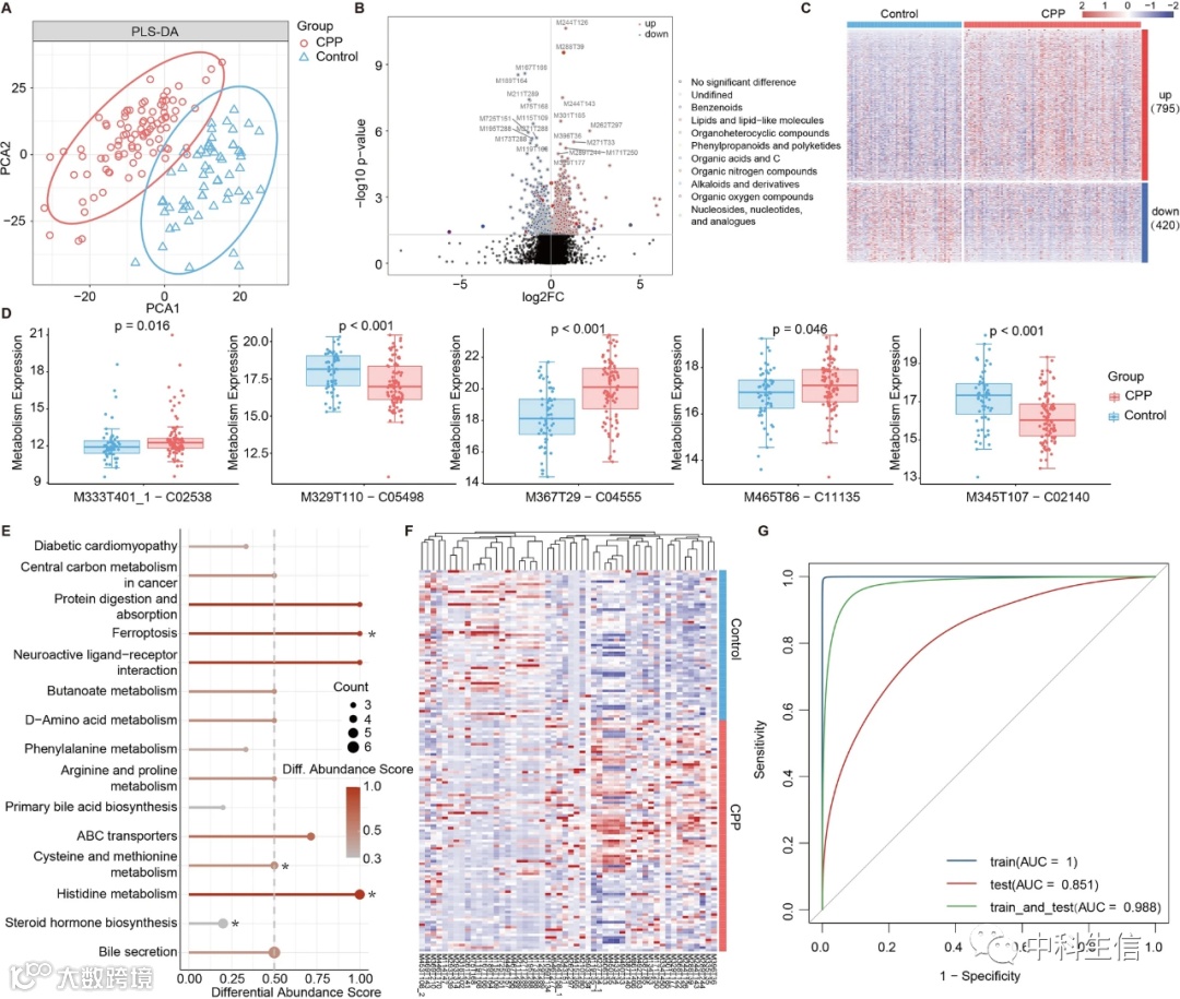 为了进一步细化 CPP 的特征,我们对来自 150个体(包括 91 个 CPP 患者和 59 个健康对照)的粪便样本进行了非靶向代谢组学分析,并鉴定出 15,411 种可能来自微生物组和宿主的化合物(包括 8949 个正离子和 6771 个负离子) . 偏最小二乘法判别分析 (PLS-DA) 揭示了 CPP 和健康对照组之间阳性和阴性粪便代谢物的显着分离(图 3 A)。比较 CPP 和健康对照之间正离子代谢物的丰度,我们发现 1215 种代谢物在 CPP 中表达不同,其中 795 种上调,420 种下调。这些代谢物包括类脂分子、有机氮化合物、苯丙醇和聚酮化合物(图 3B–C)。此外,通过相同的方法鉴定出1255种差异显著的负离子代谢物,其中695种上调和560种下调。为了进一步了解这些差异代谢物的功能及其对宿主的影响,我们接下来进行了功能富集分析和差异丰度 (DA) 评分,以捕捉与健康对照相比通路代谢物的上调或下调趋势。最后,在我们的分析中确定了至少 3 种代谢物的 15 条途径,其中 10 条呈上升趋势(图 3E,DA > = 0.5)。这些在 CPP 中过度激活的途径主要涉及半胱氨酸和甲硫氨酸代谢、组氨酸代谢和神经活性配体-受体相互作用(图 3E )。尽管类固醇代谢没有表现出相同的趋势(图 3D ),但是三种代谢物在CPP中高表达,它们在CPP中受到干扰(图 3E ),可能影响性早熟的治疗。这些结果表明代谢物的改变和功能与 CPP 相关。因此,我们使用正离子代谢物构建分类器并识别出 52 种特征性代谢物(图 3F )。基于正离子分类器的训练集、测试集和训练-测试集的性能评估均表现出较好的分类效率,其AUC分别为1、0.85和0.988 (图 3G )。总体而言,我们确定了 CPP 和健康对照组之间的差异代谢物,并基于粪便代谢物构建了一个随机森林分类器。