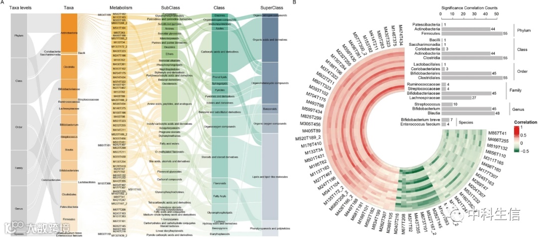 同样,我们分别计算了 CPP 组中 6 个水平的差异表达微生物和差异表达血液代谢物的 Spearman 相关系数。该分析还使用了带有注释名称的代谢物,这些代谢物同时考虑了正离子和负离子模式。在 99 种差异代谢物中,我们观察到 64 种代谢物与 21 种肠道微生物在 6 个水平上有很强的相关性(相关系数 > = 0.3 或 < = - 0.3,BH 校正的 p 值 < 0.05)。这些代谢物涉及脂质和类脂质分子、有机酸和衍生物、苯丙烷和聚酮化合物以及有机氧化合物等(图 6A )。与之前的观察结果一致,我们还发现在 CPP 组中表现出更高丰度的 Blautia 属、链球菌属和双歧杆菌属与 M430T323 (Tubacin) 有很强的关联。此外,Blautia 和双歧杆菌与 M247T196(色氨酸甜菜碱,图6B)呈正相关 。