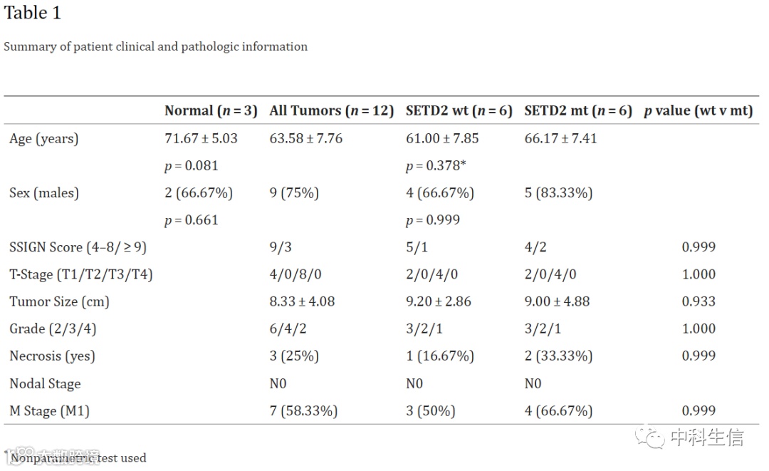 由泌尿生殖病理学家(MLS)鉴定出主要含有组织学上存活的肿瘤细胞的石蜡包埋组织(FFPE)块。将来自每个块的切片切割并安装在玻璃载玻片上,然后将每个载玻片进一步分成3-6个区域用于 DNA 分离。DNA 提取和基因组突变图谱确定使用靶向下一代测序癌症基因组。从这些样品中,鉴定了6个 SETD2野生型(wt)和6个 SETD2突变体(mt)病例。列出每个肿瘤的临床和病理特征。从国家疾病研究交流中心(NRDI)获得了三个速冻非癌性肾组织样本。