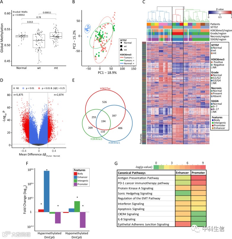 对正常肾和 ccRCC 进行了甲基化差异分析。在正常和肿瘤之间鉴定了397个与增强子相关的 DMCpGs (图2D)。使用来自表观基因组路线图的 ChIP-seq 数据,我们定义了一组正常的肾活性增强子,作为与活性调节区组蛋白标记 H3K27ac 和 H3K4me1相交的区域,但不是活性启动子相关的 H3K4me3标记。利用这些区域,我们在正常和肿瘤之间鉴定了397个与增强子相关的 DMCpGs(图2E)。相对于 EPIC 阵列上的所有 CpGs,8749个 DMCpGs 在启动子,体,基因间和增强子特征中也有差异富集,启动子变化代表性不足,增强子 DMCpGs 过度表达(图2F) ,表明正常肾增强子是 ccRCC 中表观基因组失调的靶标,特别是对于高甲基化事件。Ontology分析显示 ccRCC DMCpGs 定位于与肿瘤驱动因子和抗癌治疗途径相关的基因,包括 PD-1免疫治疗,侵袭/转移(上皮-间充质转化(EMT)和 CXCR4信号传导)和炎症(干扰素和 IL8信号传导,图2G)。
