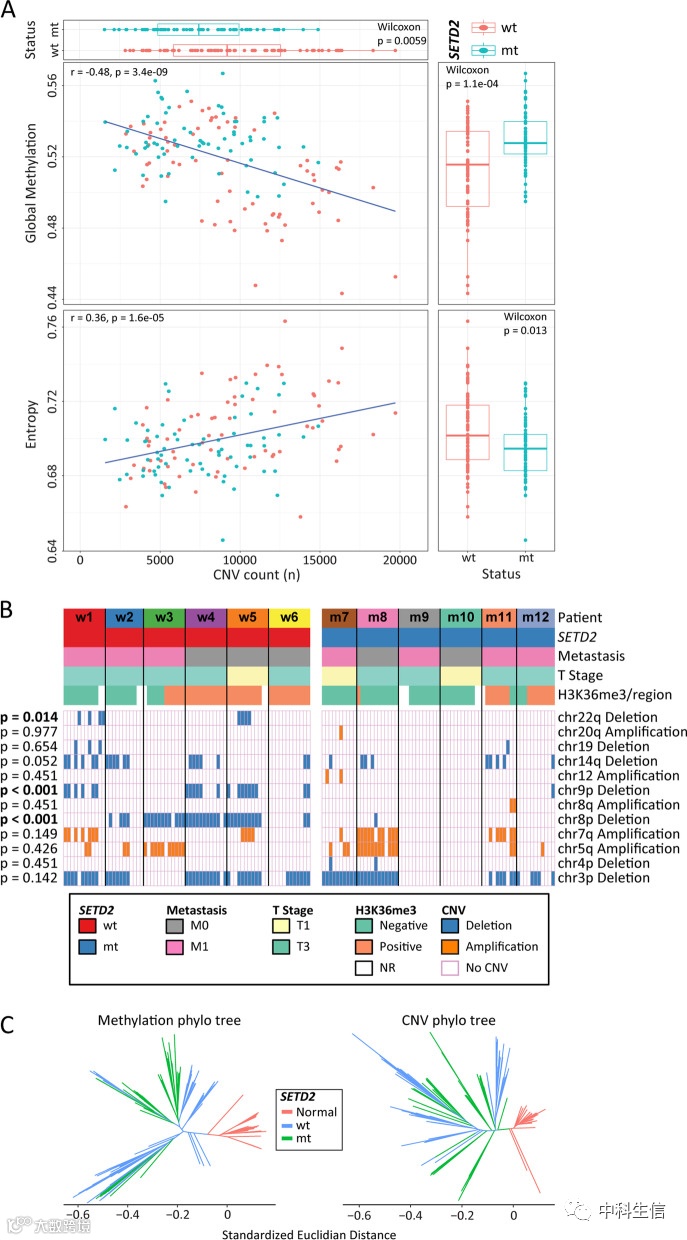 在 SETD2wt 和 SETD2mt 肿瘤区域之间观察到 CNV 的显著差异(图6A,顶部)。总体而言,甲基化与 CNV 事件数量呈负相关(图6A,上图) ,总 CNV (增益和损失)的数量与5mC 熵正相关(图6A,下图) 。研究结果确实显示这组临床相关CNV 的 ITH,对应于 SETD2 wt 肿瘤的区域中 chr8p 缺失(p < 0.001) ,chr9p 缺失(p < 0.001)和 chr22q 缺失(p = 0.014)显著过度表达(图6B)。基于5mC 的系统表观遗传树明显大于基于 CNV 的系统发生树(图6C),表明甲基组比基因组中具有更多样化的环境。综上所述,这些发现表明CNV与甲基化和熵显示出相反的关系,并且总体而言,甲基组是ccRCC中比CNV更大的变异性来源。