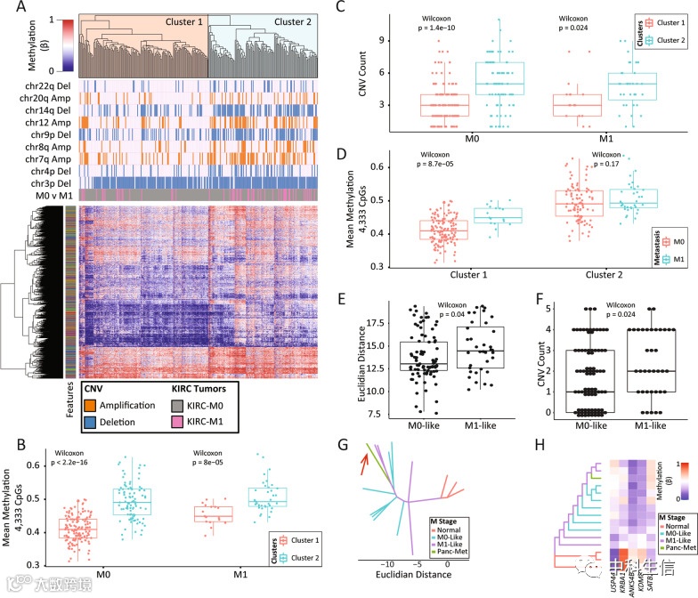 分析表观遗传ITH数据,以探测区域5mC变异与ccRCC转移潜力之间的联系。通过无监督层次聚类查询TCGA-KIRC数据,发现使用5000个最易变的CpG的甲基化将转移的原发性ccRCC(M1)与未转移的原发性ccRCC(M0,p=5.23×10-4分开。将这一结果与本研究的甲基化数据相结合,获得5000个最易变的CpG中的4333个用于进一步分析。一些CNV事件以前被认为与ccRCC的侵袭性和转移有关,在两个阵列平台上保守的4333个CpGs和TCGA-KIRC中SNP阵列计算出的CNV数据,用于分析图6B中使用的同一组扩增和缺失。观察到形成了两个ccRCC集群,集群1富集于M0肿瘤,集群2富集于M1肿瘤,总体上在富集于M1的5mC集群2中CNV富集程度更高(图7A)。M1富集群2中的CcRCCs也有明显的高甲基化,并携带更多的CNVs,不考虑其转移状态(图7B、C)。此外,集群1中的M1样本,尽管看起来被 "错误分类",但相对于集群1中的M0来说,是明显的高甲基化(图7D)。这表明集群2中的M0 ccRCCs尽管没有转移,但至少在TCGA提供的随访期间,与M1肿瘤一样具有高甲基化。