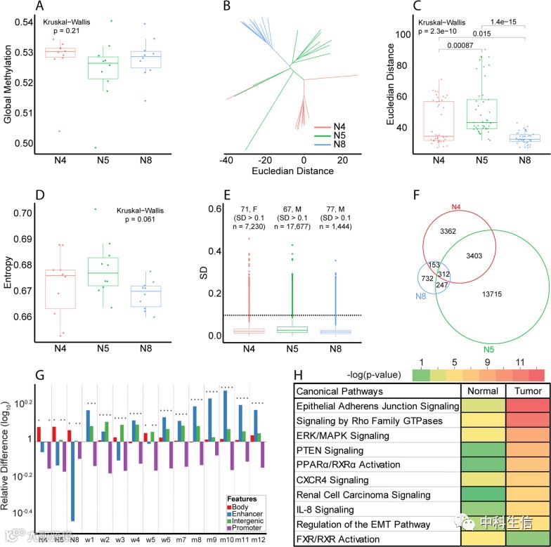 5mC数据在三个正常基线之间没有观察到显著的熵差异(图3D),测量每个 cpG 的标准差(SD)来查询肾内变异性,观察到非常低的5mC 变异性(cpG 的中值 SD 低于0.1,图3E)。高度可变 CpGs 的数量(SD > 0.1)在三个肾脏之间变化,NDK5最大,NDK8最小。高度可变的CpG往往是各自患者独有的,仅有41.16% 与其他至少一个正常肾脏共享(图3F) ,表明这组正常肾脏变量CpG具有明显的随机性。可变 CpGs 在基因体中富集,但在增强子和启动子中耗尽(图3G)。检查12个 ccRCC 中高度可变的 CpGs (SD > 0.1)时,这种特征相关的趋势完全逆转,增强子中最可变的肿瘤 CpGs 富集,而基因体富集减少(图3G)。Ontology分析显示,来自正常组的增强子 CpGs 与常见的肿瘤发生途径(例如 EMT 和肾癌信号传导)弱相关,这与肿瘤增强子CpG不同,后者富集用于癌症相关通路,如MAPK,PTEN和CXCR4信号传导(图3H)。这些发现表明肾内甲基化变异水平总体较低,并且确实显示异质性的适度数量的 CpG 对每个患者都是独特的。