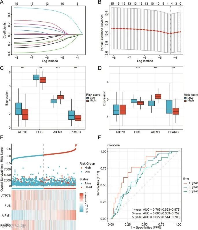 LASSO 回归模型的分析确定了四个关键基因: ATP7B、FUS、AIFM1和PPARG,预示着关键决定因素。根据风险评分中位值将样本分为高、低风险组,比较 TCGA-BRCA 和综合数据集中两组关键基因表达水平,结果显示几乎所有关键基因在两数据集中均有显著表达差异(P<0.001),其中 ATP7B、FUS 和 PPARG 在低风险样本中高表达,AIFM1 在高风险样本中高表达,提示 AIFM1 可能为乳腺癌预后风险因子,ATP7B、FUS 和 PPARG 可能为保护因子;绘制 TCGA-BRCA 的 LASSO 回归风险因子图,显示乳腺癌 LASSO 模型 1 年时准确性较高(AUC>0.7),3 年和 5 年时准确性较低(AUC>0.5)。